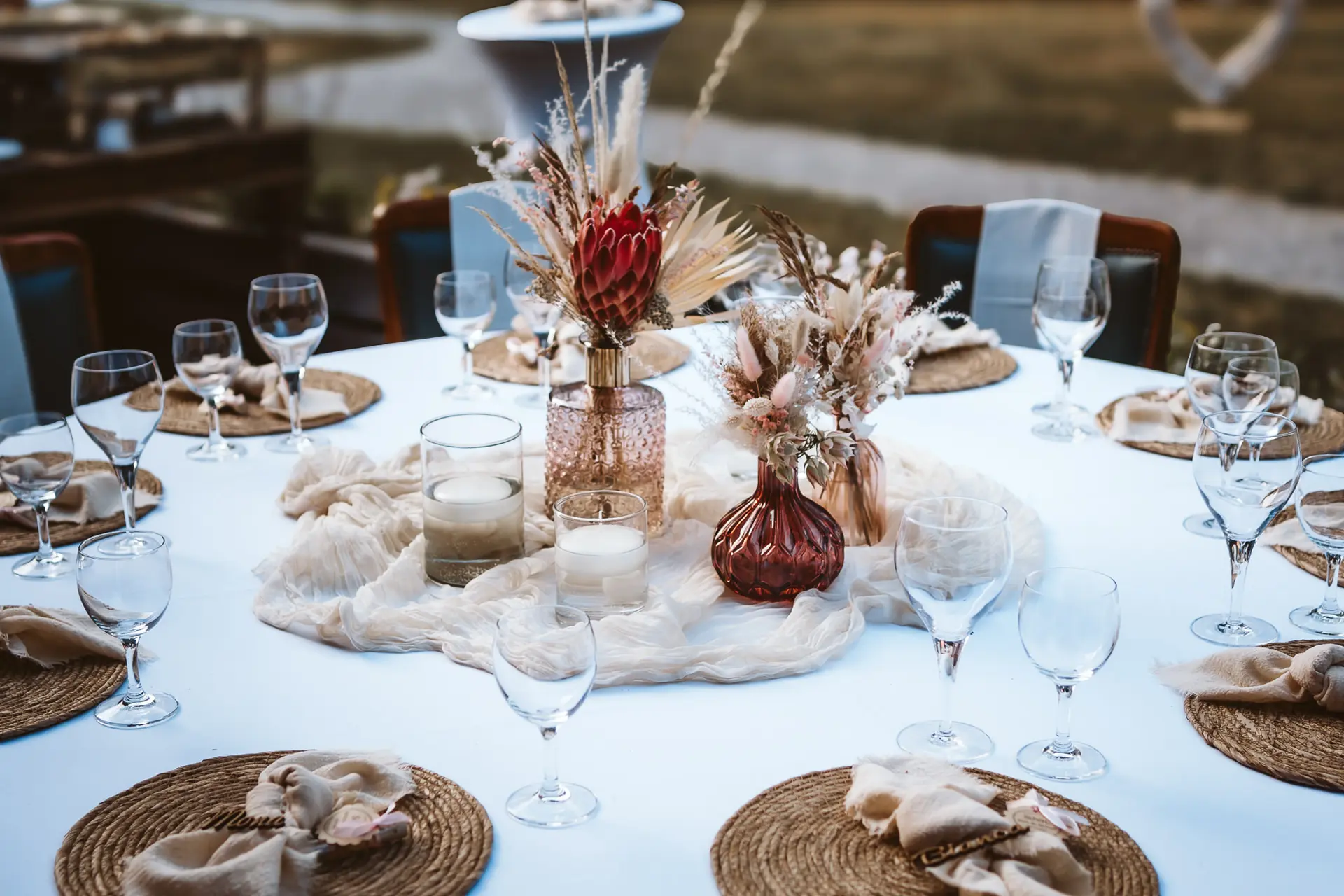 Nehmt Platz an festlich geschmückten runden Tischen oder an einer Tafel, welche in verschiedenen Varianten gestellt werden kann.